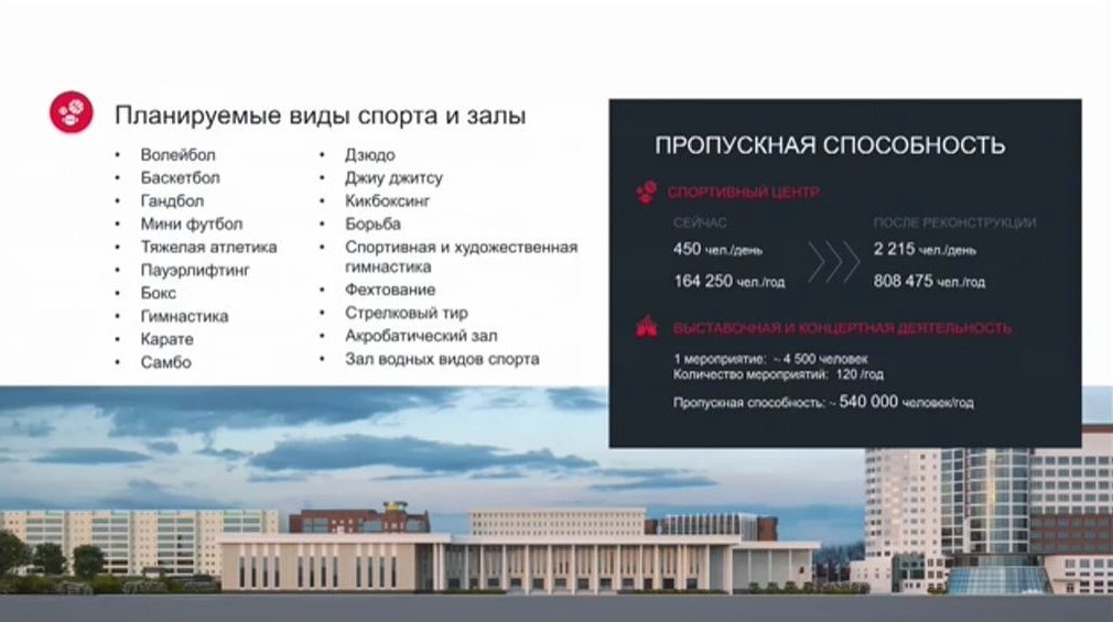 «Сейчас сооружение функционирует как Дворец спорта, сегодня это три площадки в основной арене, по периметру еще три спортивные площадки, мы проводим чемпионаты России, области, спортивные мероприятия, выставки, концерты. Но есть необходимость в его реконструкции. Мы хотим создать многофункциональный спортивно-оздоровительный комплекс с полноценным тренировочным процессом, где будут заниматься и взрослые и дети», — сообщил Михаил Штадельман.