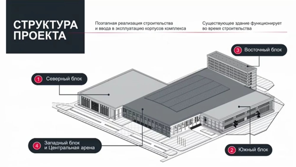 Согласно проекту, к основному корпусу, который есть сейчас, планируется пристроить еще несколько, каждый блок будет строиться поэтапно — северный, южный, восточный, потом основная арена.