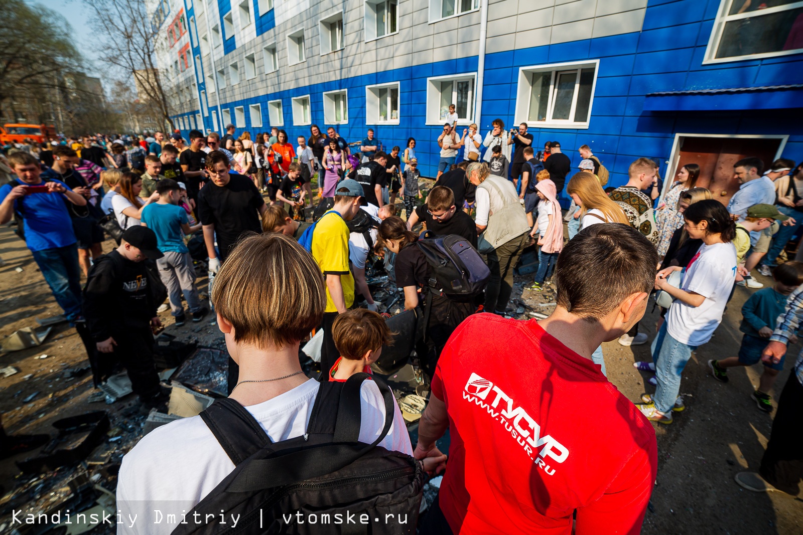 По словам корреспондентов vtomske.ru, выброс длился минут десять. Когда выброс техники завершился и ограждения у общежития сняли, толпа людей подбежала к разбившейся технике и начала их разбирать. После этого вуз всегда убирает остатки сломанных мониторов, чтобы направить на переработку.