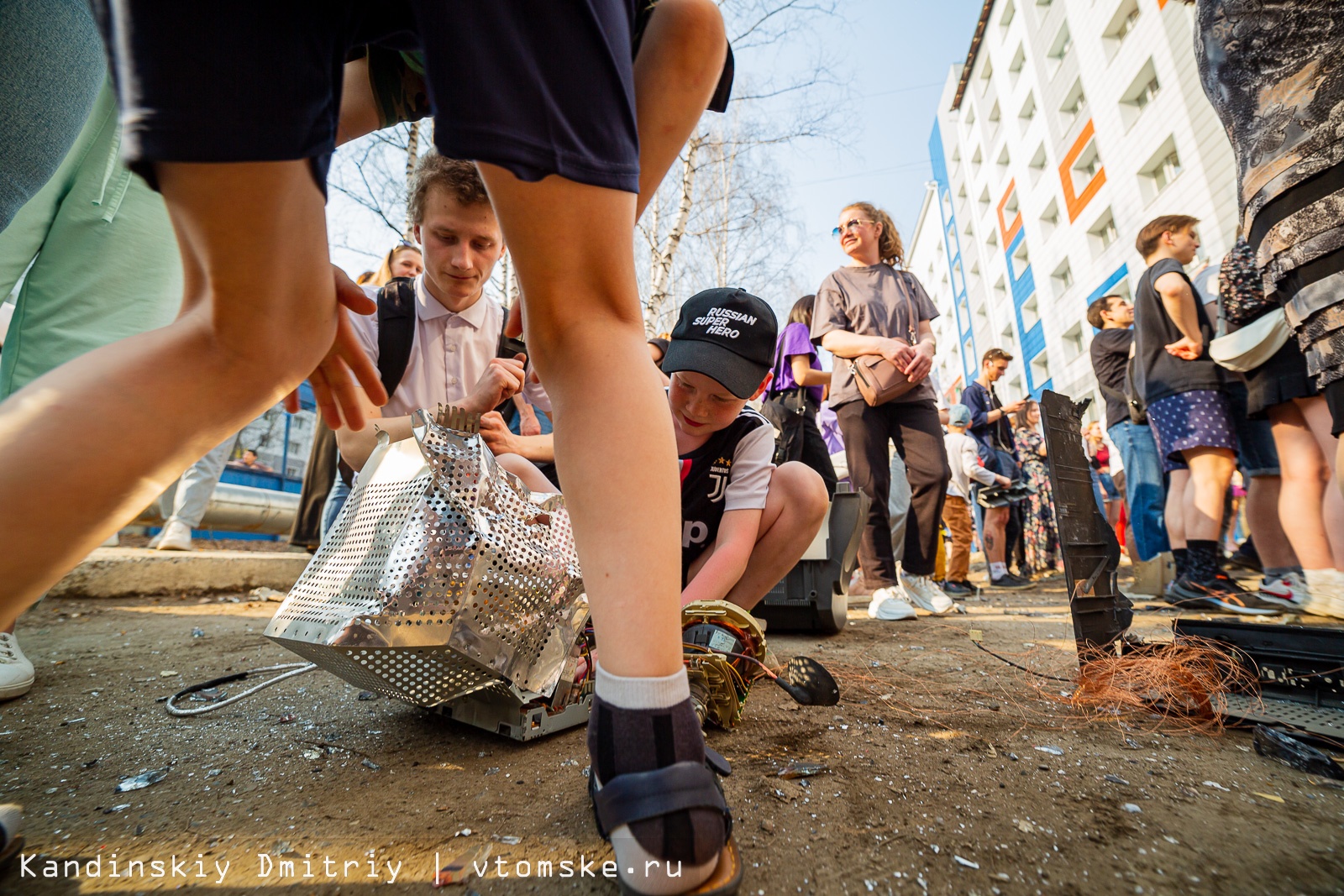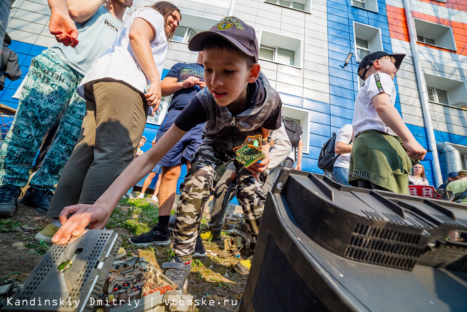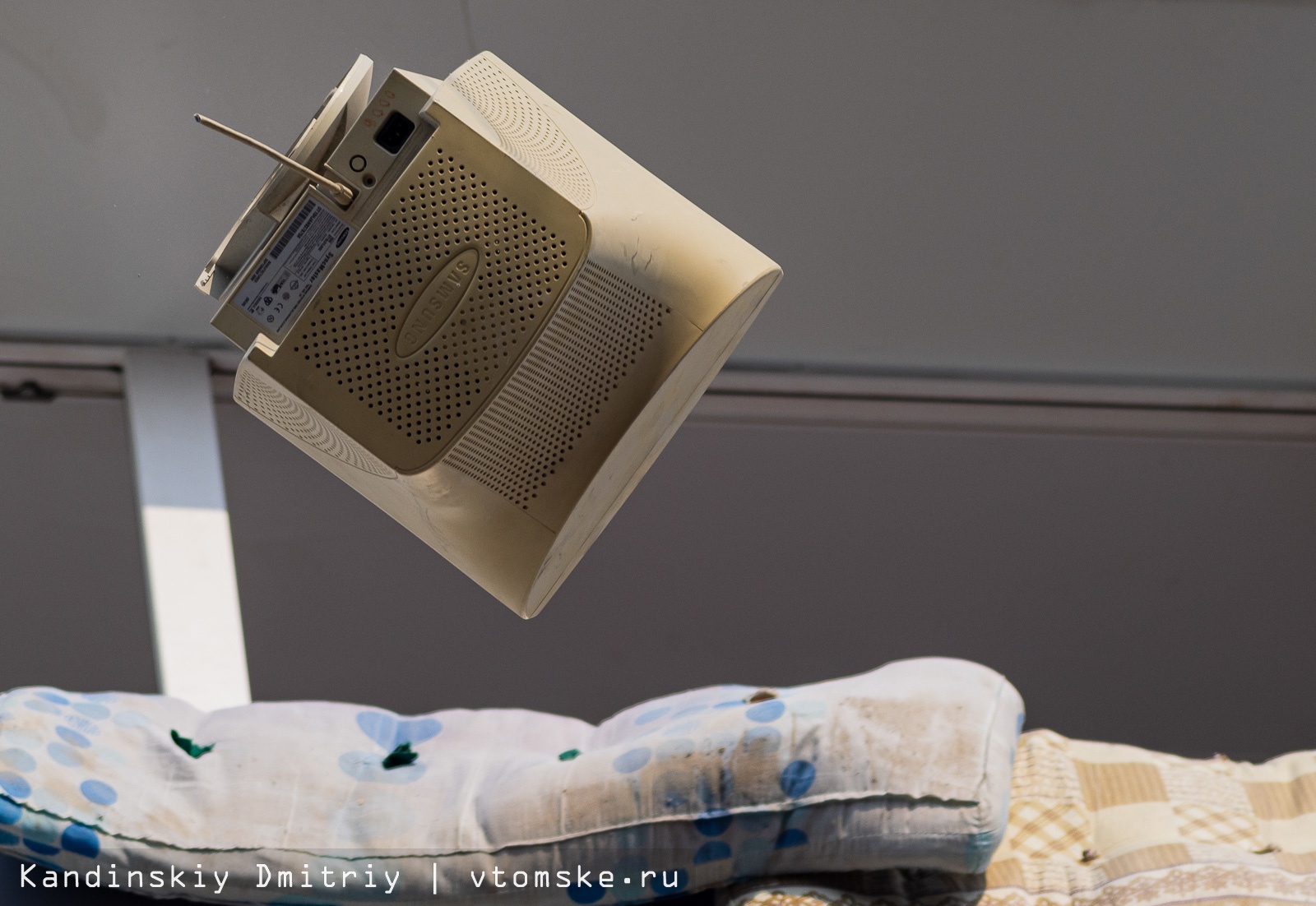 В этом году из окон выбросили ламповые телевизоры, компьютеры, мониторы. Традиционно это шоу привлекает несколько десятков томичей, много детей, которые с интересом наблюдают за летящей техникой.