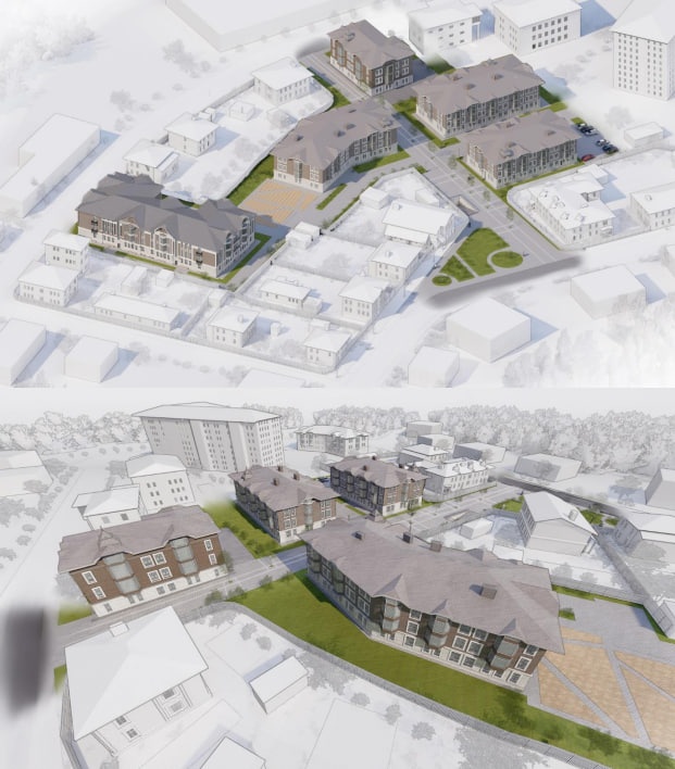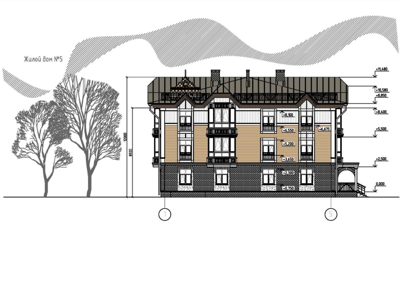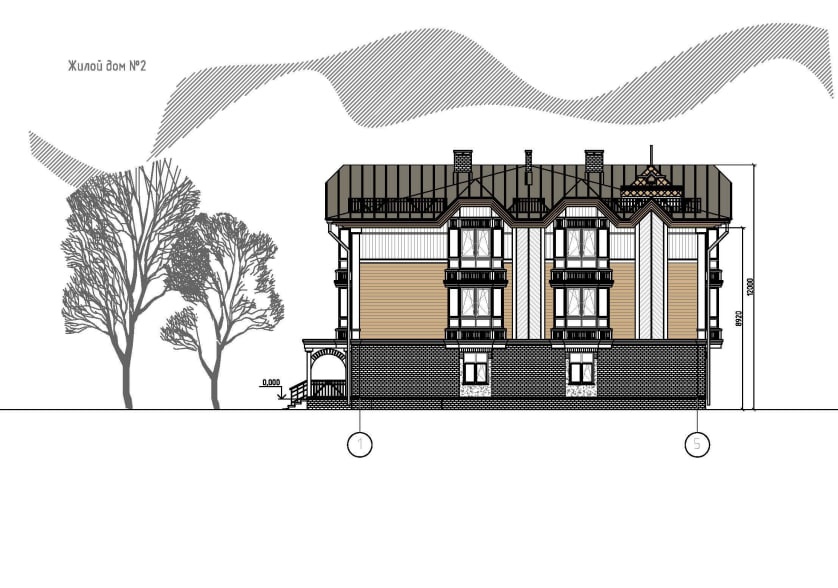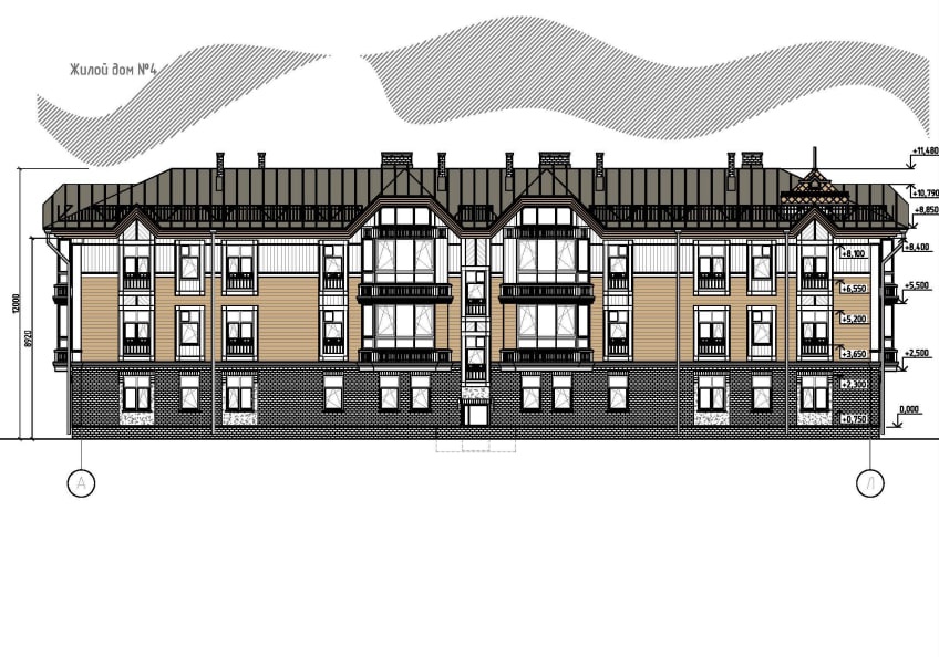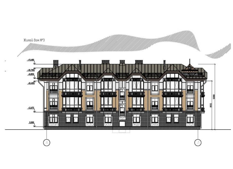 Из информации из проекта, выполненного ООО «Простор», следует, что дома будут трехэтажными со скатной кровлей, высота до карниза — 9 метров, высота до конька кровли — 12 метров. Первый этаж, согласно проекту, отделан кирпичом, отделка второго-третьего этажей — фиброцементной деревянной доской — прямой или с орнаментом «елочка».