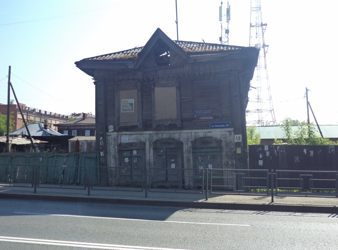 Двухэтажный деревянный дом на улице Яковлева, 18, построен в первой трети XX века. Общая площадь — 160 «квадратов». Является объектом фоновой исторической застройки, включен в перечень объектов деревянного зодчества, в отношении которых установлен особый правовой режим, предусматривающий сохранение историко-архитектурного облика при проведении ремонтных работ.
