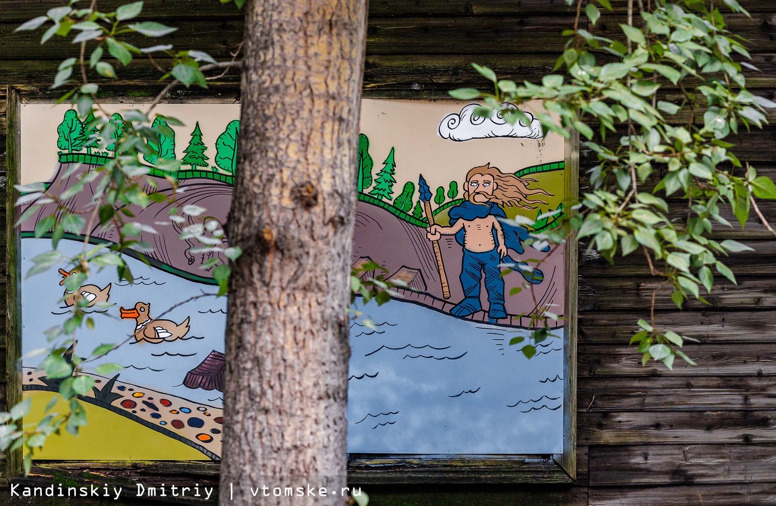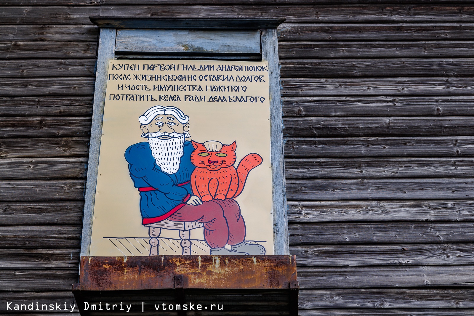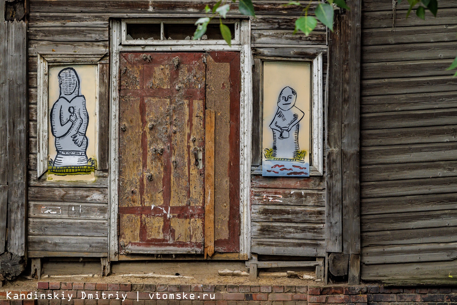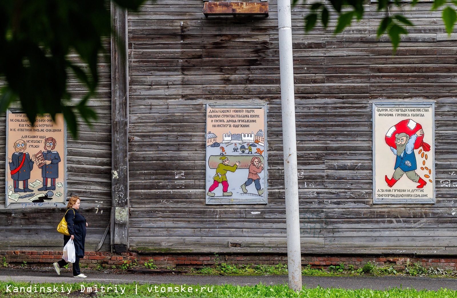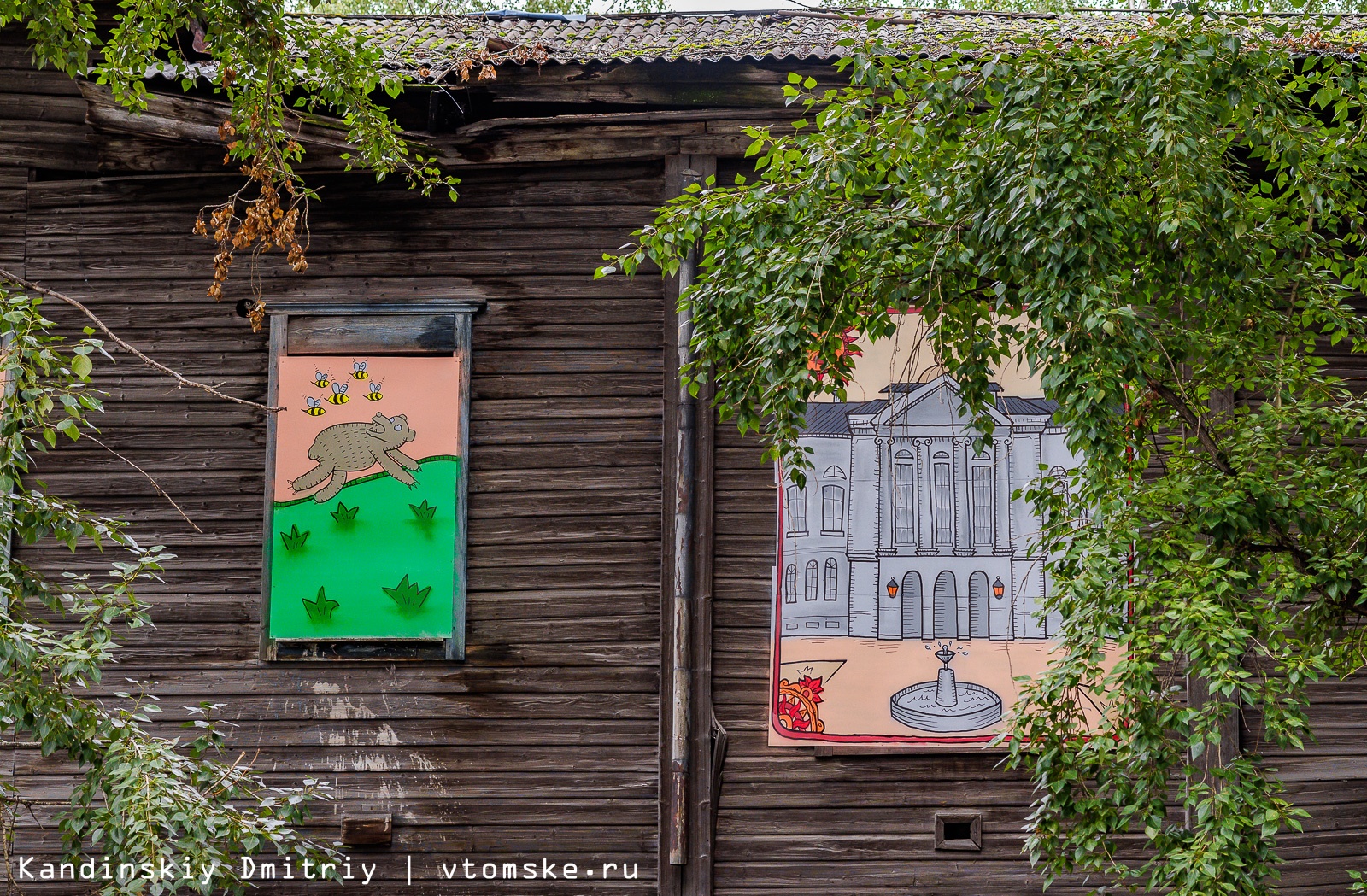 Заколоченные окна двухэтажного деревянного дома на улице Советской, 106, украсили необычными рисунками. Изображения сделаны в лубочном стиле и рассказывают про известные места и личностей Томска из дореволюционной эпохи.