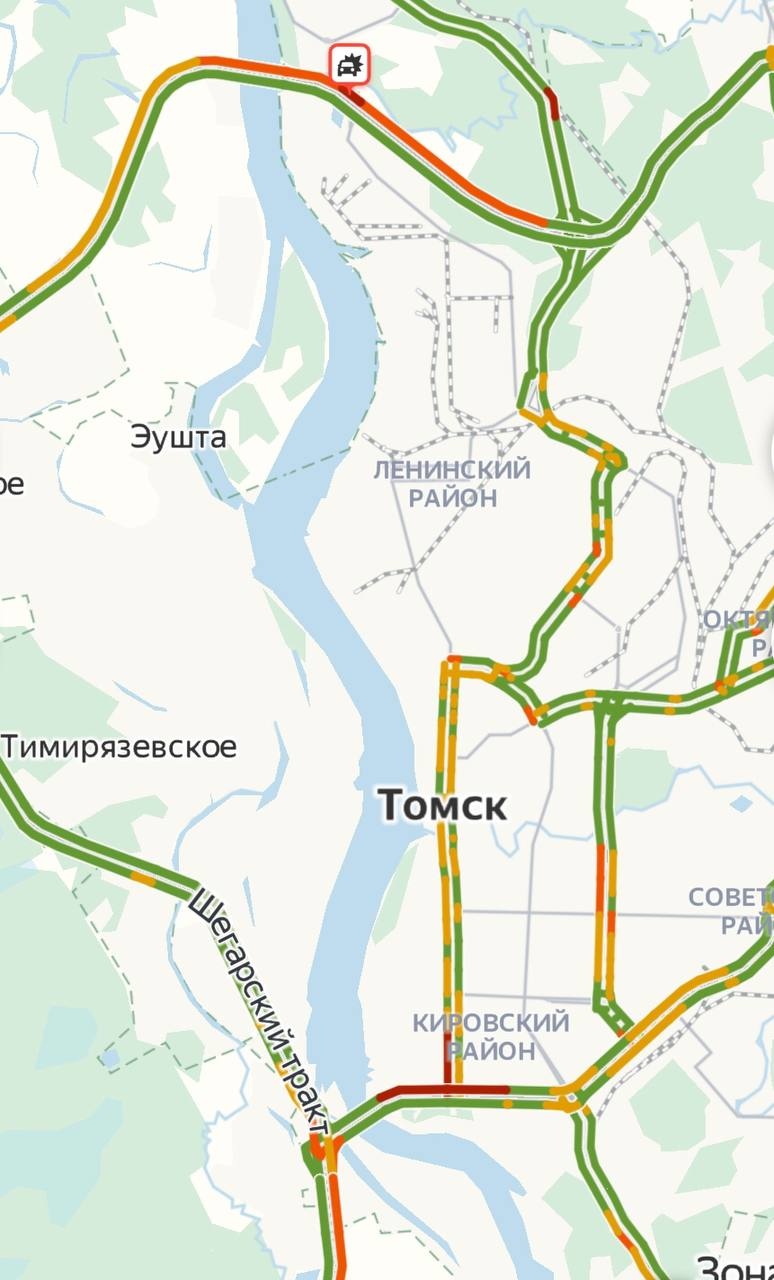 Сильные заторы, согласно данным «Яндекс.Навигатор», наблюдаются в настоящее время на Коммунальном мосту, Шегарском и Московском трактах, улице Нахимова, проспекте Ленина, а также на выезде из города через Северный мост.