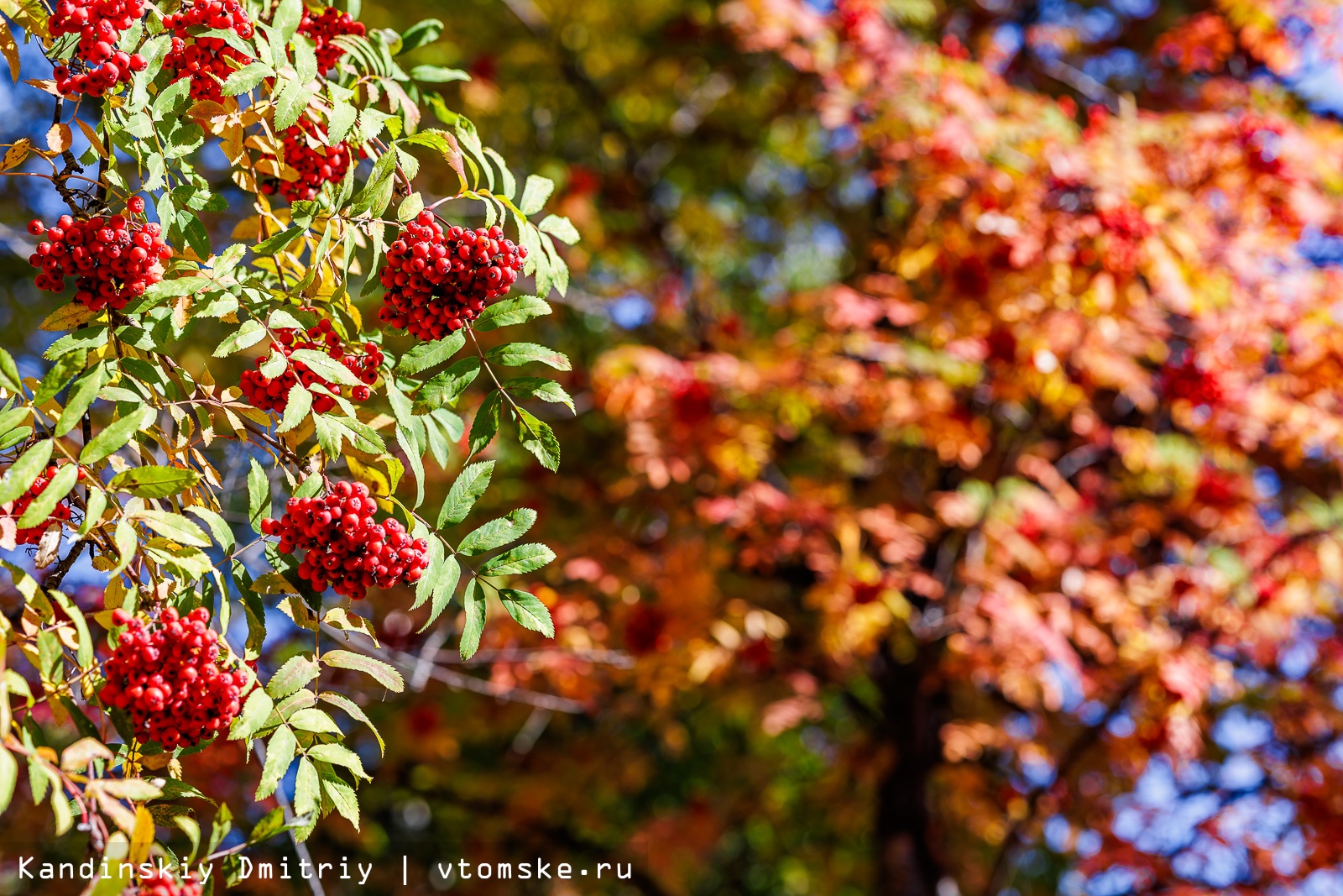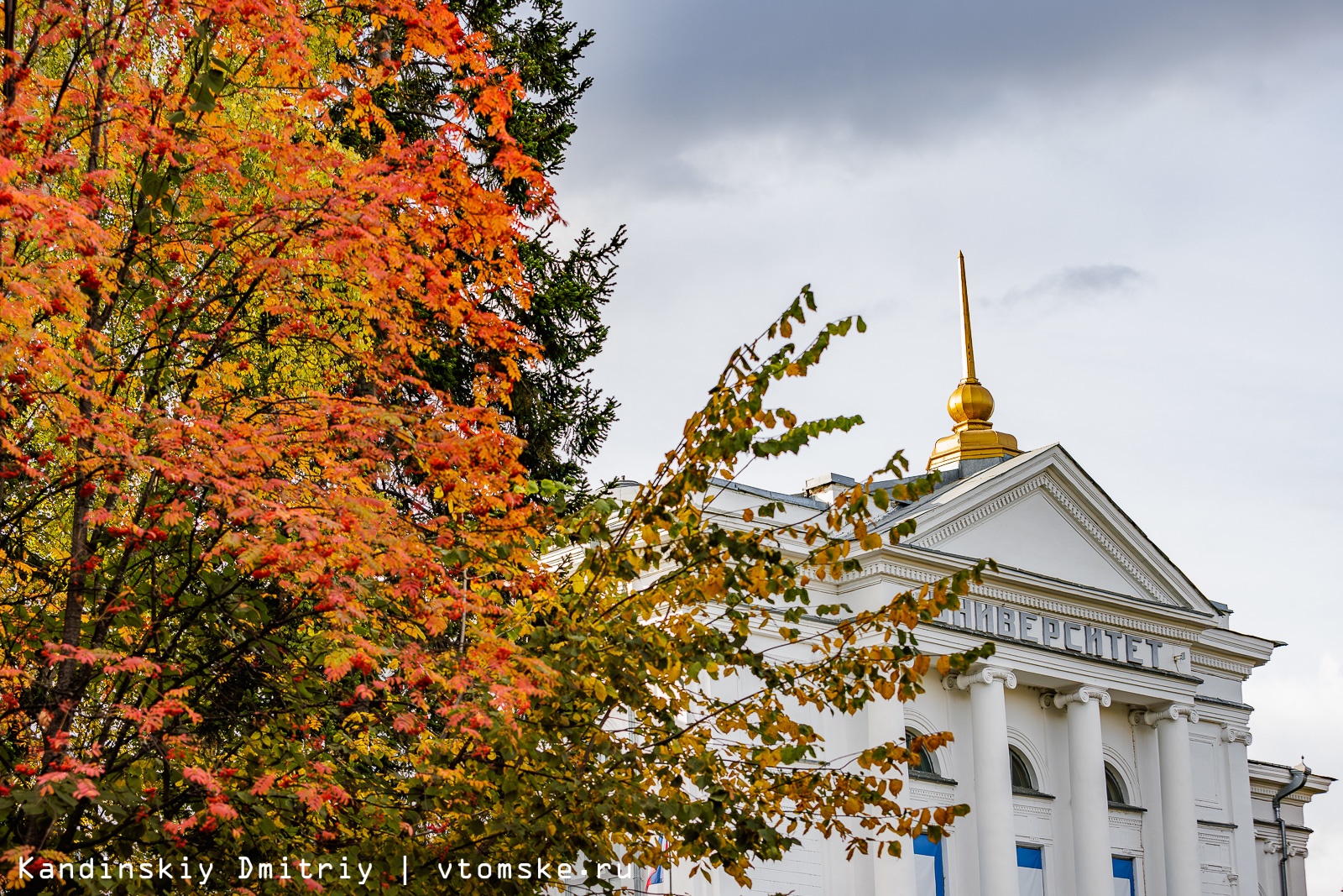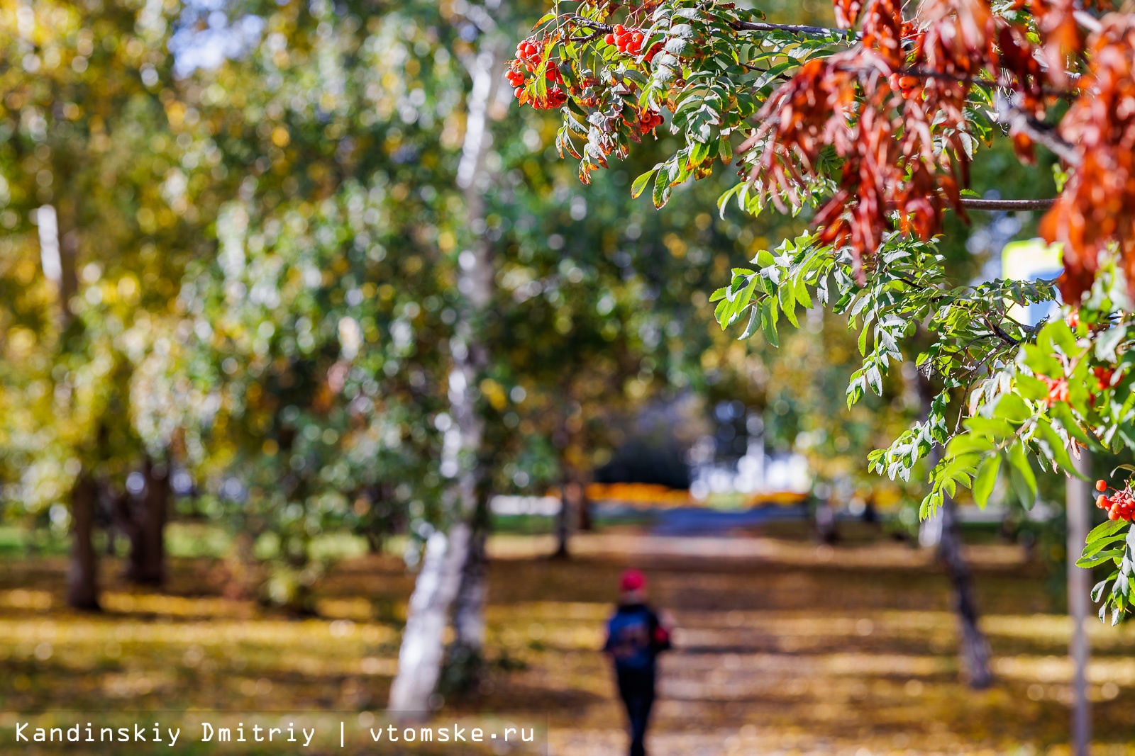 Золотая осень пришла в Томск. Деревья в парках и на улицах города меняют цвет с зеленого на желтый, оранжевый и даже красный. Листья каскадами падают вниз, укрывая землю золотым ковром; а ягоды рябины становятся все более красными.