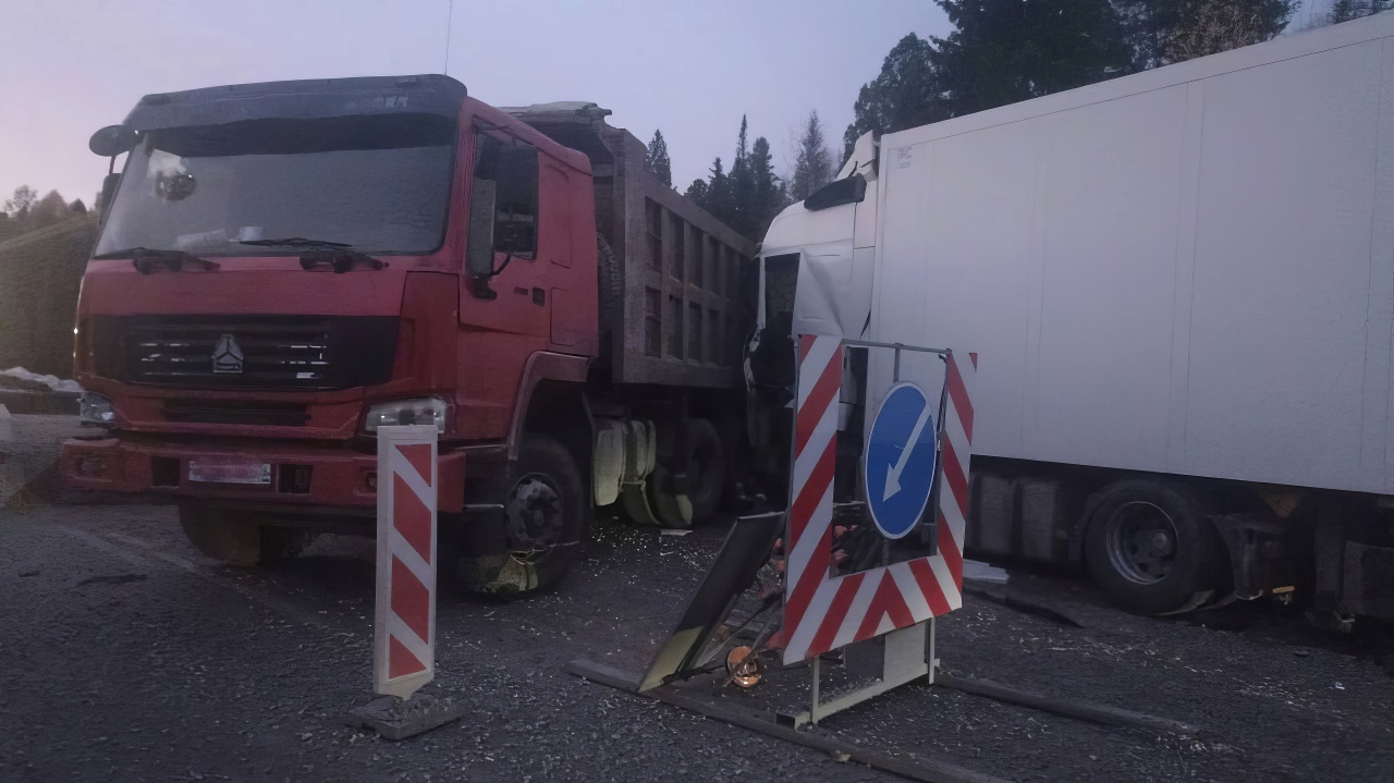 Водитель фуры попал в больницу, врезавшись в бетонные блоки и два грузовика на томской трассе