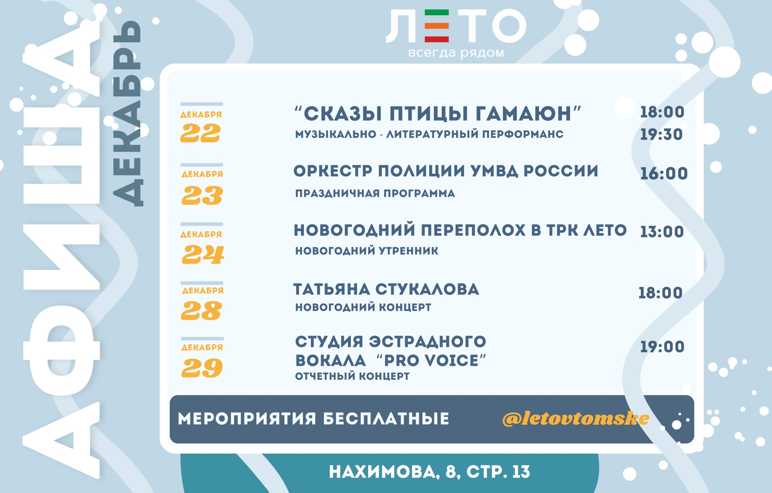 24 декабря в 13:00 — семейная новогодняя программа «Новогодний переполох», настоящий новогодний утренник. Главные действующие лица Дедушка Мороз, Снегурочка, Снеговичок, Дракоша, Баба Яга и творческие коллективы Томска! Танцы, хороводы, серебряная дискотека, подарки и многое другое.