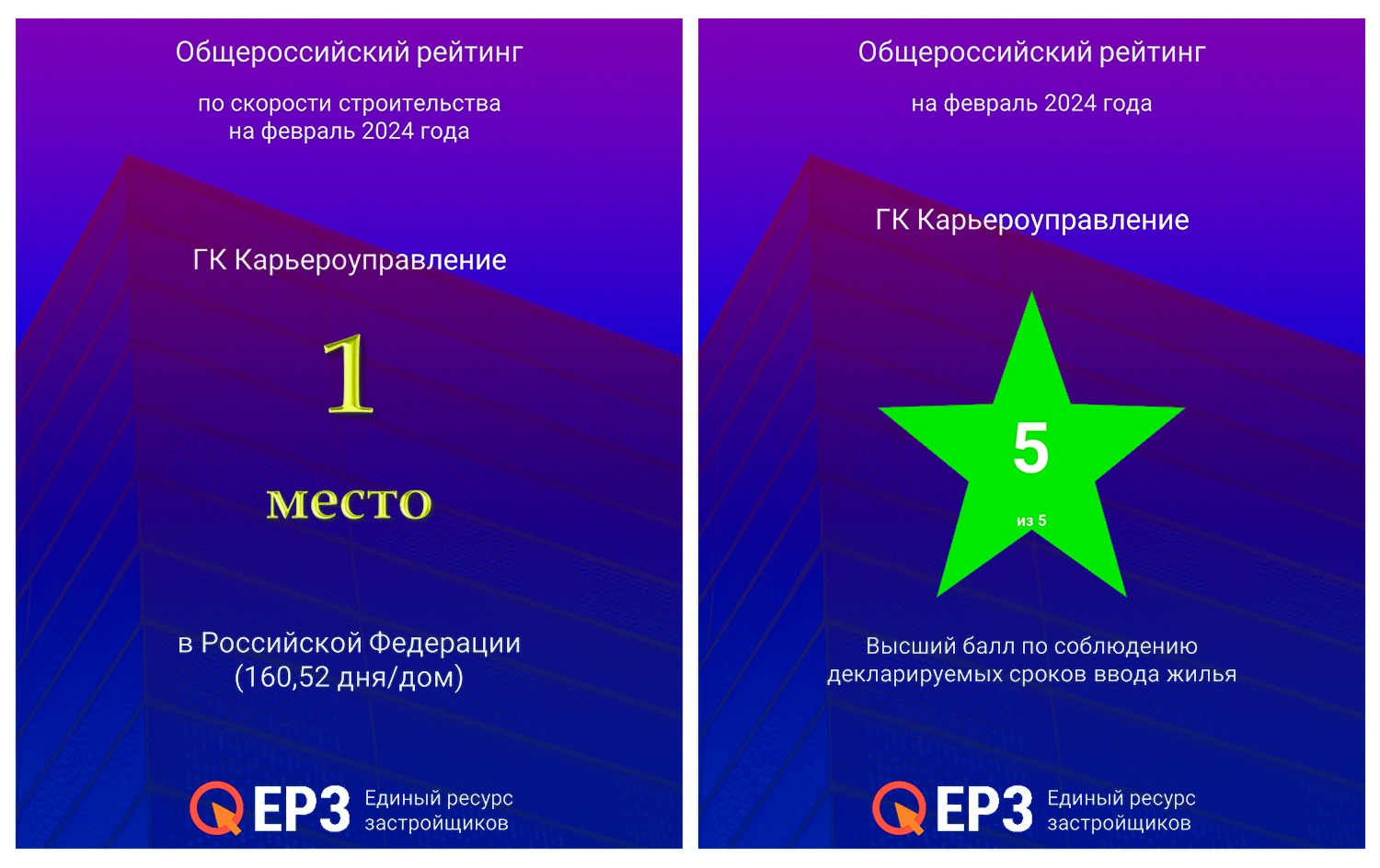 По данным рейтинга ГК «Карьероуправление» занимает первое место по скорости производства строительных работ в Российской Федерации с показателем 160,52 дня на возведение дома. Таких результатов удалось достигнуть благодаря грамотному планированию бизнес-процессов и слаженной работе всего коллектива компании под руководством Заслуженного строителя России Екатерины Собканюк.