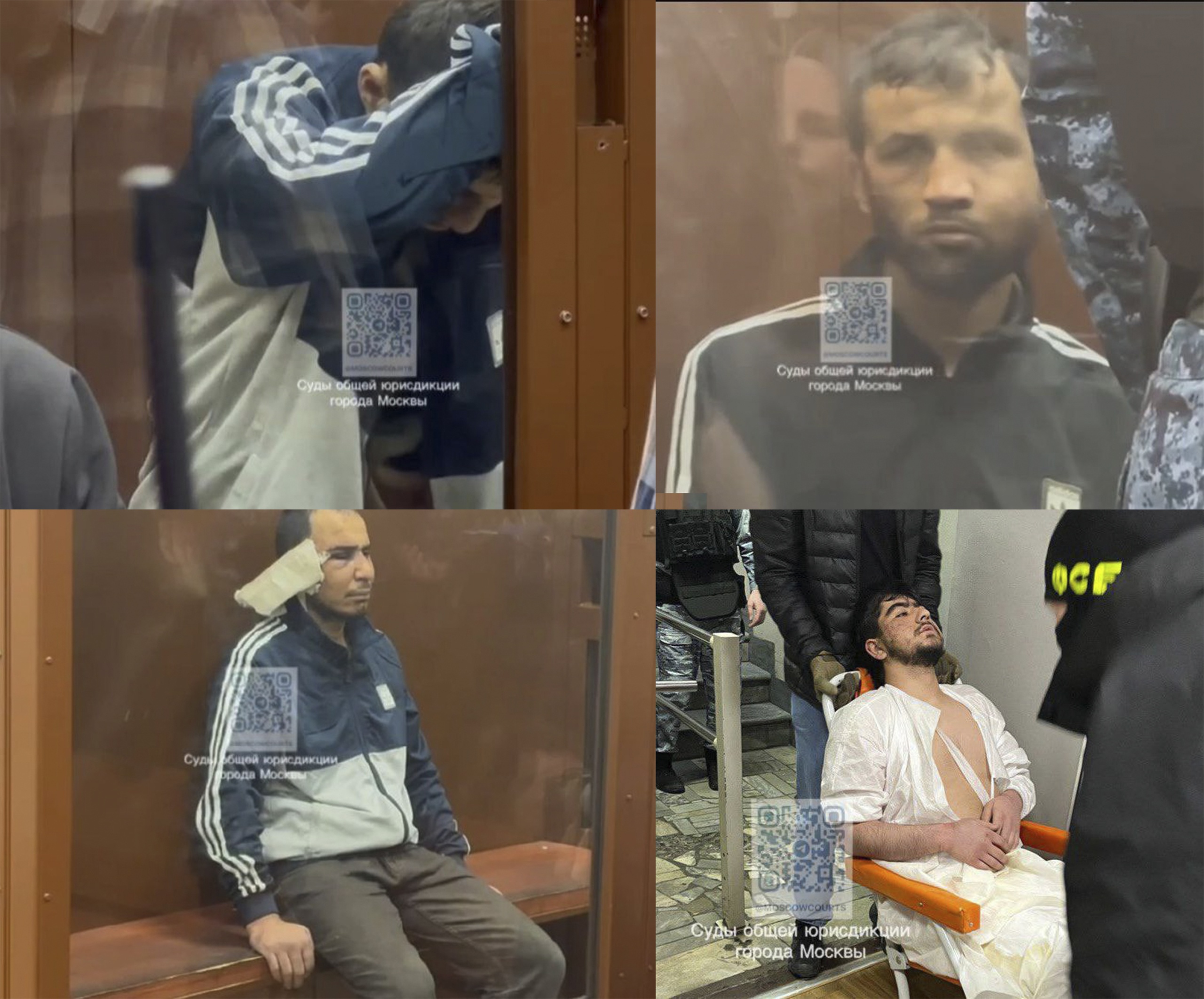 - 30-летний Рачабализода Саидакрами (его привели в зал с перевязанной головой; отметим, что в соцсетях накануне распространялась видеозапись, на которой, как утверждалось, был запечатлен допрос задержанного участника нападений на «Крокус», где ему отрезают ухо);