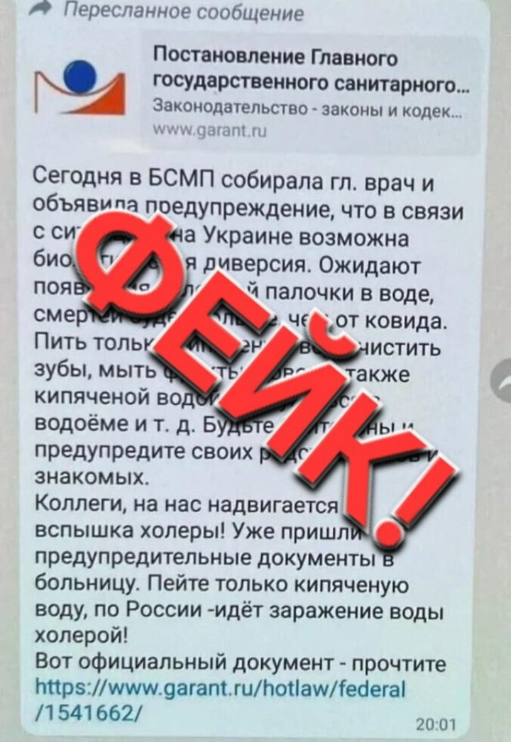 «В Томской области на номера телефонов пользователей мессенджеров массово стали поступать сообщения, содержащие ложную информацию о биологической диверсии и вспышке холеры. Данная информация является фейковой. Роспотребнадзор призывает быть бдительными и не распространять подобные сообщения без проверки достоверности информации, которую можно получить на официальных сайтах и в социальных сетях управления», — говорится в сообщении от 2 апреля.