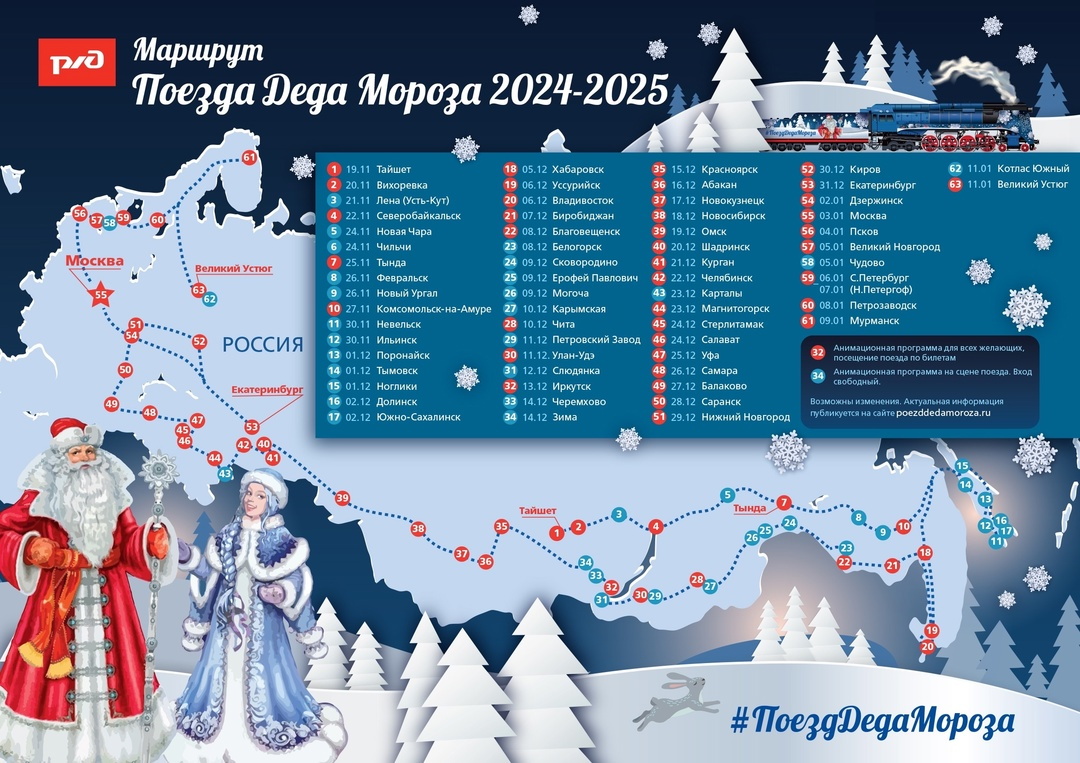 «В этом году волшебное путешествие начнется с нулевого километра Байкало-Амурской магистрали — города Тайшет. <...> Также мы посетим города Сибири, Дальнего Востока, Урала, Севера и европейской части нашей страны. Не обойдется без новых маршрутов: если погода не станет нам преградой, то мы отправимся с Дедушкой Морозом на остров Сахалин», — сообщают организаторы.