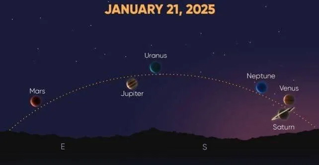Вечером, сразу после захода Солнца, на небе выстроятся Сатурн, Меркурий, Нептун, Венера, Уран, Юпитер и Марс. Четыре из них — Меркурий, Венера, Юпитер и Марс — будут легко видны невооруженным глазом.