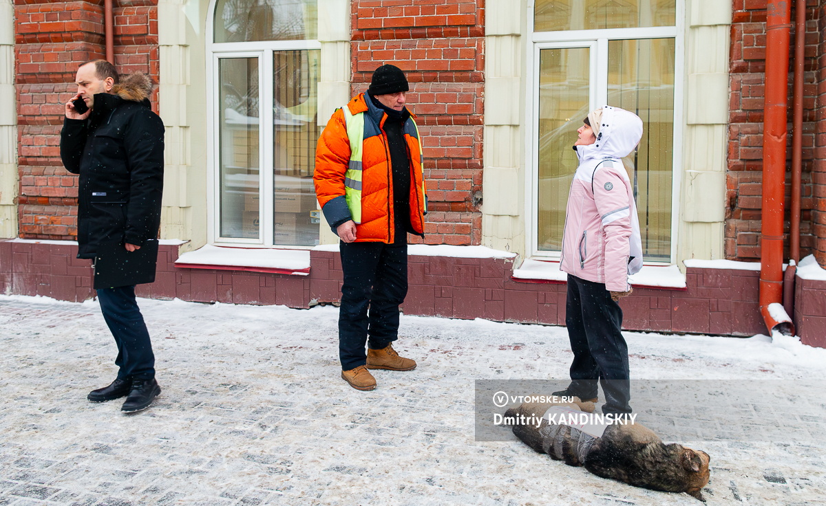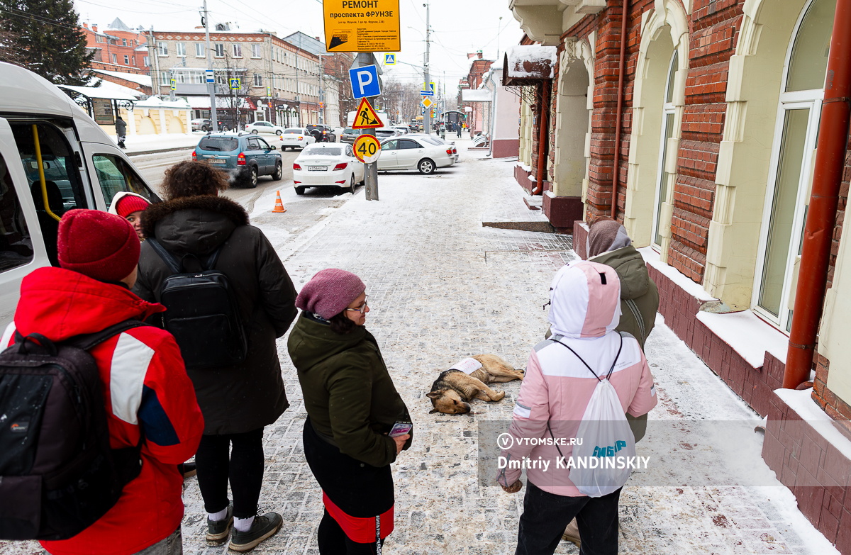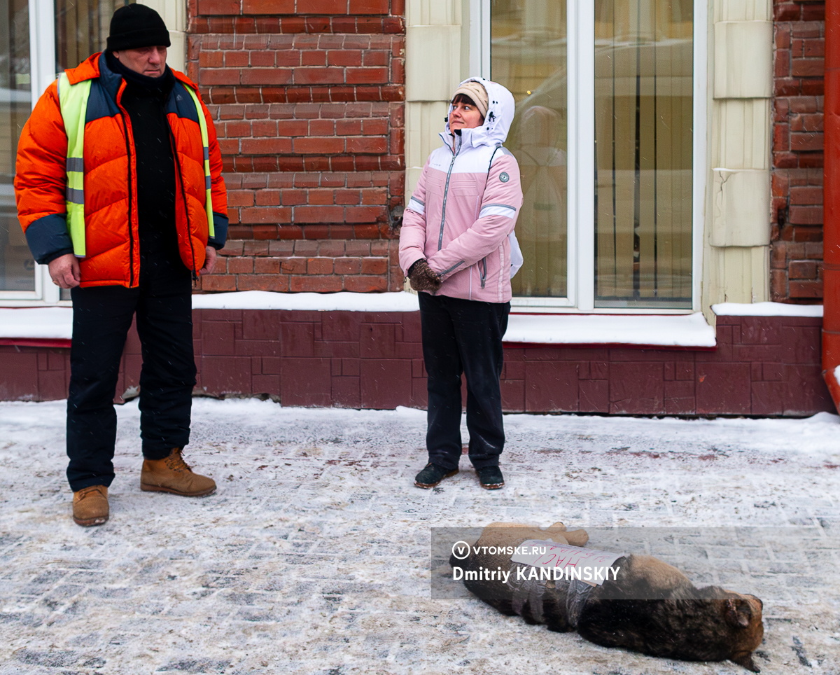 Около животного стояла томичка Юлия Власова. Девушка пояснила журналистам, что эта собака погибла накануне: ветеринар считает, что ее отравили. По словам Власовой, случаи отравления животных выросли в 2024 году, после того, как у города сменился подрядчик по отлову бездомных собак.