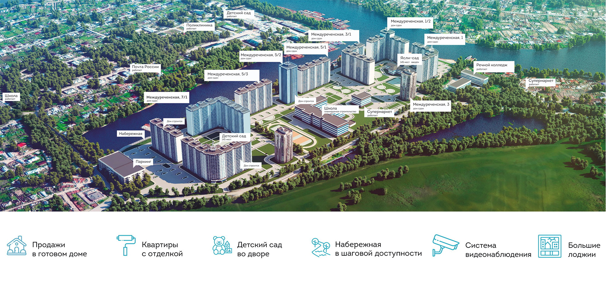 Квартал у реки живописный и комфортный. Локация — удивительная, из окон квартир открываются восхитительные виды.