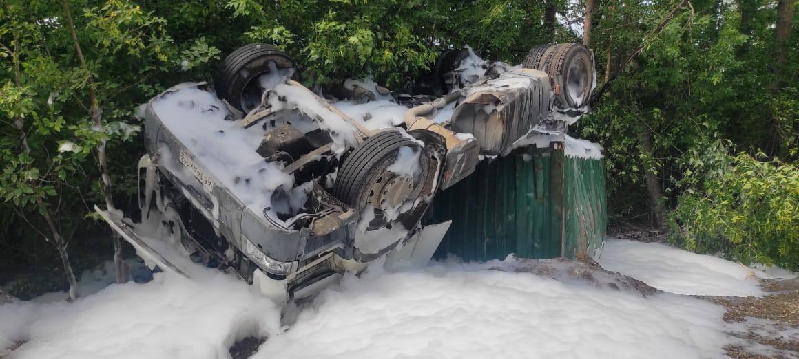 По предварительной информации, водитель грузовика пытался избежать столкновения с легковым автомобилем, который выехал на встречную полосу. Изменив траекторию, он не справился с управлением, съехал с дороги, и транспорт опрокинулся. Предположительно, легковой автомобиль был серебристого цвета. Его водитель с места происшествия скрылся.