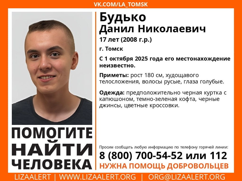 Ранее добровольцы сообщали о пропаже в Томске 17-летнего Данила Будько. С 1 октября его местонахождение неизвестно.