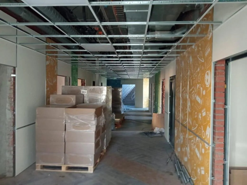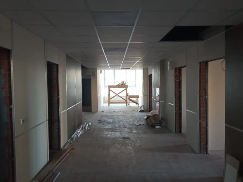 Объект готов на 85%. Подрядная организация завершает внутреннюю отделку и проводит пусконаладку инженерных систем — вентиляции, водоснабжения, пожарной сигнализации и системы оповещения. Параллельно ведется строительство подъездной дороги, которая обеспечит удобный доступ к поликлинике для пациентов и спецтранспорта. Также предусмотрены тротуары и парковочные места.