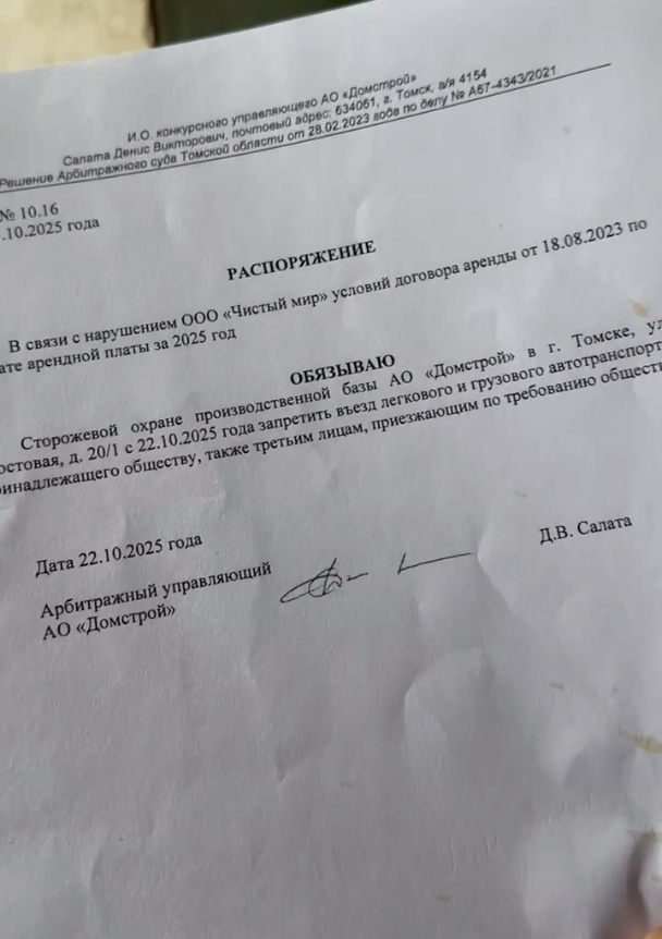 На опубликованных «Чистым миром» кадрах видно распоряжение руководства АО «Домстрой», владеющей производственной базой. В документе сказано, что автомобили перерабатывающей компании не пускают «в связи с нарушением условий договора аренды по оплате арендной платы за 2025 год».